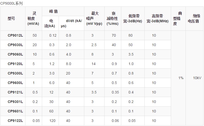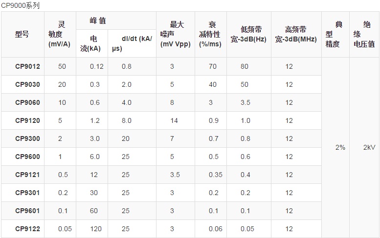 CP9000(S/L)系列柔性电流探头是仅测试AC电流信号的探头,具有高带宽,高精度(典型值2%)等特点。可以实现宽广的电流测量范围,频率可从几Hz到数十MHz,电流范围从mA级别到数kA级别,大大解决了电流测试的难题。其主要特点包括:线圈轻巧柔软且可以自由插拔,可以探测到许多硬制探头无法达到的地方,轻而易举的实现与被测对象连接;插入损耗几乎为零,仅为几个皮亨,对被测对象近乎为零的干扰;标准的BNC输出接口,很方便实现与示波器,数据采集器,数字电压表等连接,观测电流波形;USB供电接口设计,使用更加灵活方便;声光过流报警功能,更具人性化设计;探头环和连接线长度可以根据客户要求定制,满足特殊场合测试要求。